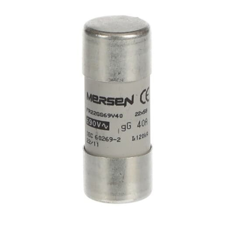 E 9F22 GG40 представляет собой цилиндрический предохранитель размером 22x58 мм для защиты по периметру.