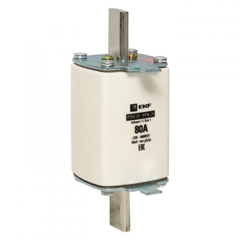 Плавкая вставка ППН-35 250/ 80А габарит 1 EKF. Предохранители плавкие ППН EKF, укомплектованные плавкими вставками типа gG/gL, предназначаются для защиты кабельных линий и промышленных электроустановок от токов перегрузки и короткого замыкания. Предохранители применяются в электрических сетях переменного тока частотой 50 Гц с напряжением до 660В. Применяются для крепления в распределительных и вводно-распределительных устройствах. Предохранители плавкие ППН могут устанавливаться в основание с держателем, а также в специально предназначенные рубильники. В комплект поставки предохранителей плавких ППН основание с держателем не входит и приобретается отдельно.