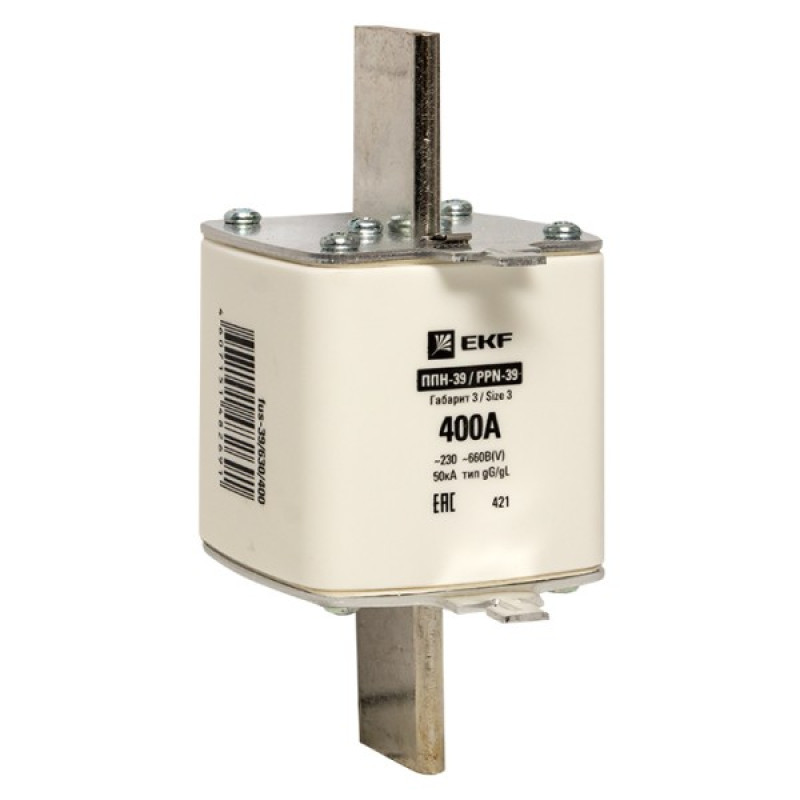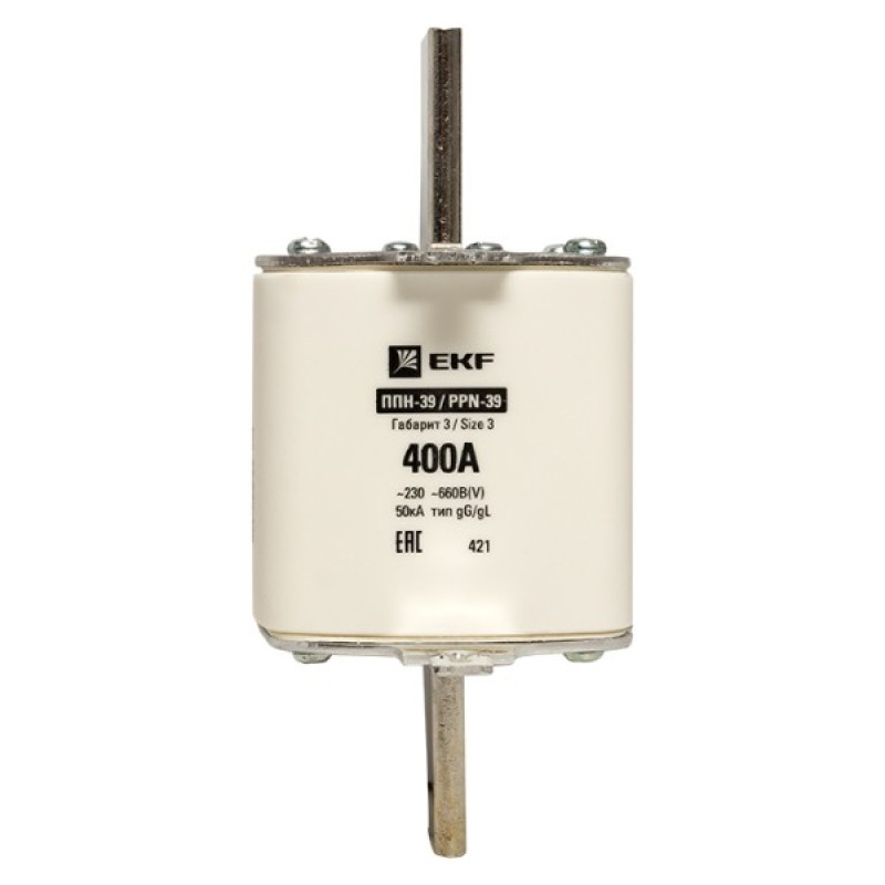 Плавкая вставка ППН-39 630/400А габарит 3 EKF. Предохранители плавкие ППН EKF, укомплектованные плавкими вставками типа gG/gL, предназначаются для защиты кабельных линий и промышленных электроустановок от токов перегрузки и короткого замыкания. Предохранители применяются в электрических сетях переменного тока частотой 50 Гц с напряжением до 660В. Применяются для крепления в распределительных и вводно-распределительных устройствах. Предохранители плавкие ППН могут устанавливаться в основание с держателем, а также в специально предназначенные рубильники. В комплект поставки предохранителей плавких ППН основание с держателем не входит и приобретается отдельно.