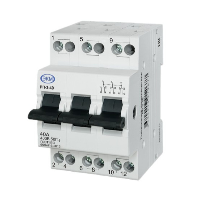 Реверсивные переключатель РП-2-40 применяется для ручного переключения нагрузки с одного ввода на другой и обратно, а также позволяет осуществлять оперативное управление участками электрических цепей.