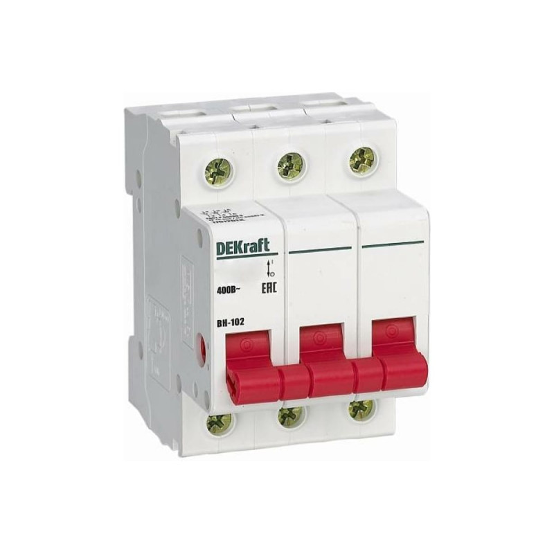 Выключатель-разъединитель серии ВН-102 DEKraft, 3P, номинальный ток 125 А, установка - на DIN-рейку, установочное положение - любое. Выключатели-разъединители применяются для ручного включения/отключения сетей напряжением до 400 В. Специальные мостиковые контакты обеспечивают надежный разрыв цепи, они полностью исключают возможность перекрытия дугой по изоляции. Усиленная рукоятка управления обеспечивает большое количество включений/отключений.