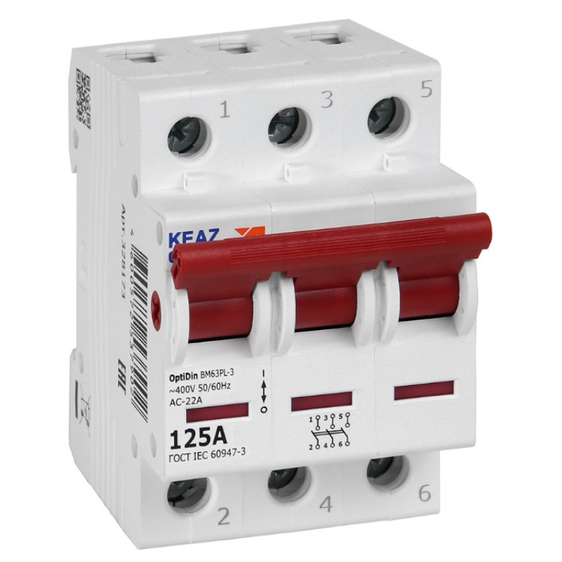 Модульный 3 полюсный выключатель нагрузки переменного тока на номинальный ток 125 А. Модульные выключатели нагрузки OptiDin ВМ63Р производства КЭАЗ используются только для коммутации цепей в вводно-распределительных щитках, как общий выключатель всей квартирной цепи. Модульные выключатели нагрузки обеспечивают самый надежный разрыв цепи.
