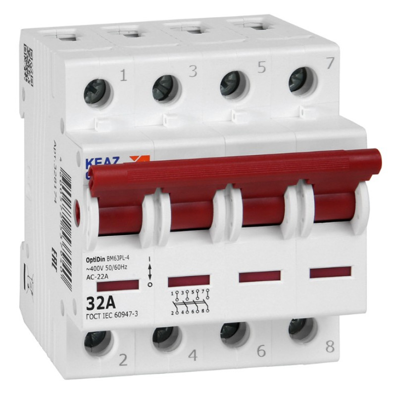 Модульный 4 полюсный выключатель нагрузки переменного тока на номинальный ток 32 А. Модульные выключатели нагрузки OptiDin ВМ63Р производства КЭАЗ используются только для коммутации цепей в вводно-распределительных щитках, как общий выключатель всей квартирной цепи. Модульные выключатели нагрузки обеспечивают самый надежный разрыв цепи.