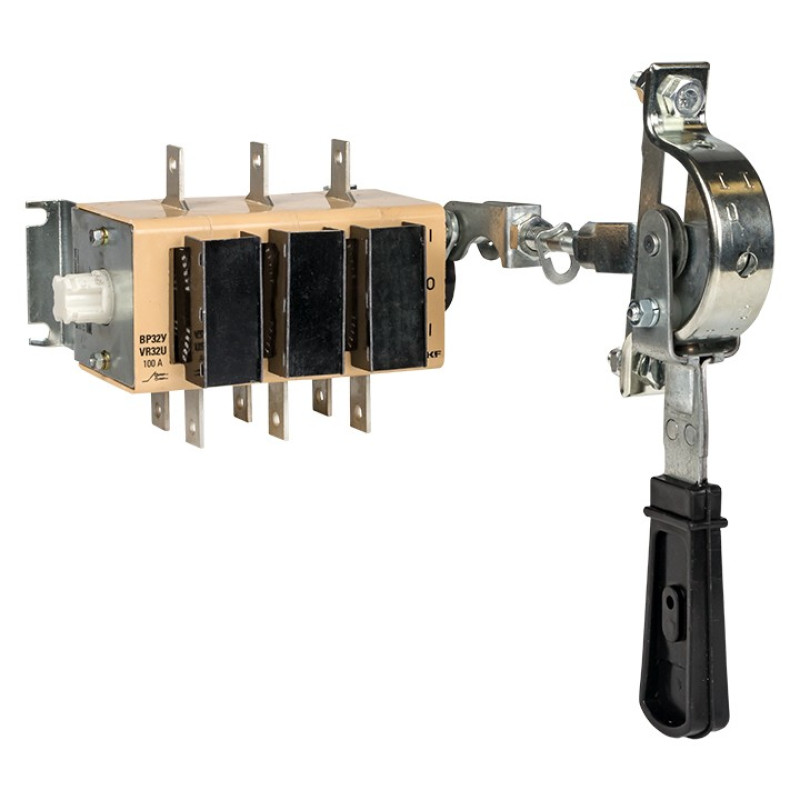 Выключатели-разъединители ВР32У (универсальные) серии MAXima предназначены для ручного включения-отключения цепей переменного тока с номинальным напряжением до 690 В частотой 50 Гц. В конструкции применена трехполюсная контактная система ножевого типа с двойным видимым разрывом цепи. С помощью двойного разрыва цепи, больших растворов контактов и дугогасительных камер обеспечивается эффективное гашение электрической дуги при коммутации нагрузок, что препятствует преждевременному и чрезмерному износу контактов. Конструкция контактных выводов обеспечивает болтовое присоединение шин или проводников, оконцованных кабельными наконечниками. Все рубильники являются универсальными по типу присоединения рукоятки. Конструкция рубильника предусматривает установку рукоятки как справа от корпуса, так и слева. Расположение рукоятки, левое или правое, можно поменять в процессе эксплуатации при необходимости. Расположение плоскости присоединения внешних зажимов контактных выводов перпендикулярно плоскости монтажа. Выпускается несколько исполнений ВР32У: • на одно и на два направления; • с несъемной рукояткой; • со съемной смещенной рукояткой.