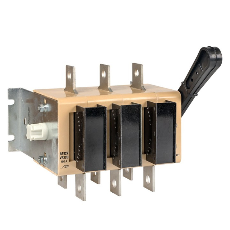 Выключатели-разъединители ВР32У (универсальные) серии MAXima предназначены для ручного включения-отключения цепей переменного тока с номинальным напряжением до 690 В частотой 50 Гц. В конструкции применена трехполюсная контактная система ножевого типа с двойным видимым разрывом цепи. С помощью двойного разрыва цепи, больших растворов контактов и дугогасительных камер обеспечивается эффективное гашение электрической дуги при коммутации нагрузок, что препятствует преждевременному и чрезмерному износу контактов. Конструкция контактных выводов обеспечивает болтовое присоединение шин или проводников, оконцованных кабельными наконечниками. Все рубильники являются универсальными по типу присоединения рукоятки. Конструкция рубильника предусматривает установку рукоятки как справа от корпуса, так и слева. Расположение рукоятки, левое или правое, можно поменять в процессе эксплуатации при необходимости. Расположение плоскости присоединения внешних зажимов контактных выводов перпендикулярно плоскости монтажа. Выпускается несколько исполнений ВР32У: • на одно и на два направления; • с несъемной рукояткой; • со съемной смещенной рукояткой.