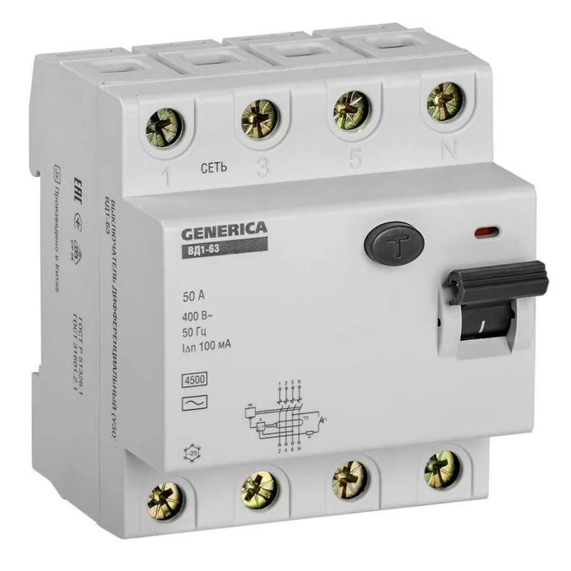 Дифференциальный выключатель IEK GENERICA УЗО ВД1-63 4Р 50А 100мА