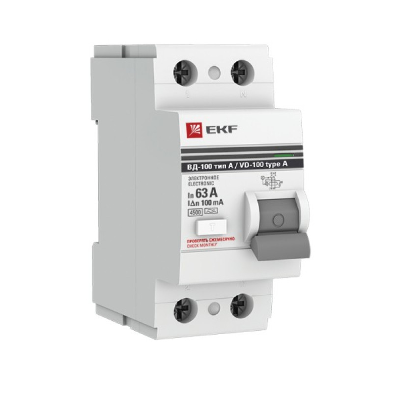 Выключатель дифференциального тока EKF ВД-100 ВДТ (УЗО) 63А 2П двухполюсный 100мА тип A электронное