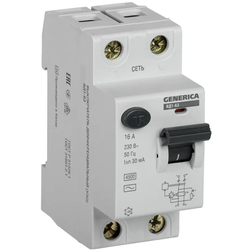 Быстродействующий защитный выключатель ВД1-63 (УЗО) GENERICA - устройство электронного типа, зависящее от напряжения и реагирующее на дифференциальный ток, без встроенной защиты от сверхтоков. Предназначен для защиты человека от поражения электрическим током.