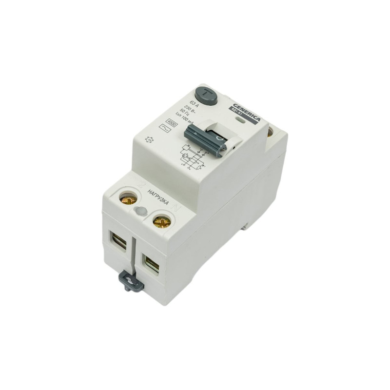 Быстродействующий защитный выключатель ВД1-63 (УЗО) GENERICA - устройство электронного типа, зависящее от напряжения и реагирующее на дифференциальный ток, без встроенной защиты от сверхтоков. Предназначен для защиты человека от поражения электрическим током.