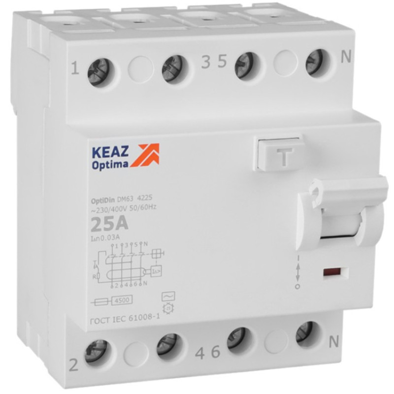Выключатель дифференциального тока (УЗО) КЭАЗ OptiDin DM63-4225-AC-4,5-УХЛ4 без защиты от сверхтоков 4П 25А 30мА AС 4,5кА