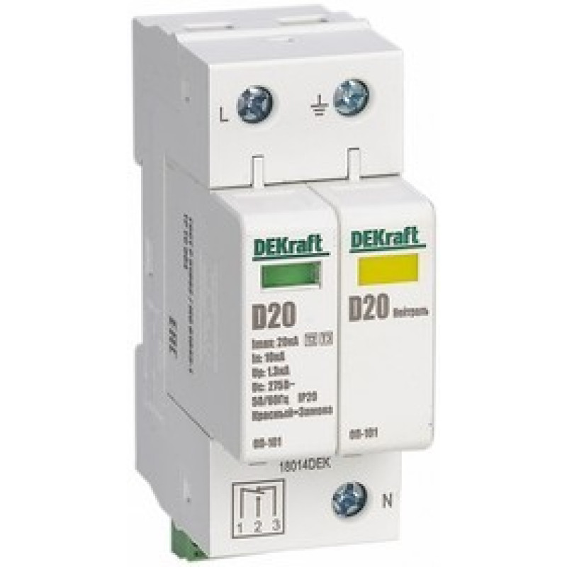Ограничитель перенапряжения серии ОП-101 DEKraft , 2P, макс.разрядный ток 40 кА, мак.рабочее напряжение 440 В, класс 2(C), монтаж - на DIN-рейку, ширина - 2 мод. х 18 мм. Ограничители срабатывают за миллиардную долю секунды и надежно защищают оборудование от бросков напряжения. Повышенный уровень защиты позволяет ограничить перенапряжения до 2 кВ. Ограничитель оснащен сигнальным контактом. Применяются во ВРУ, ГРЩ, распределительных щитках, коробках и непосредственно возле аппаратов.
