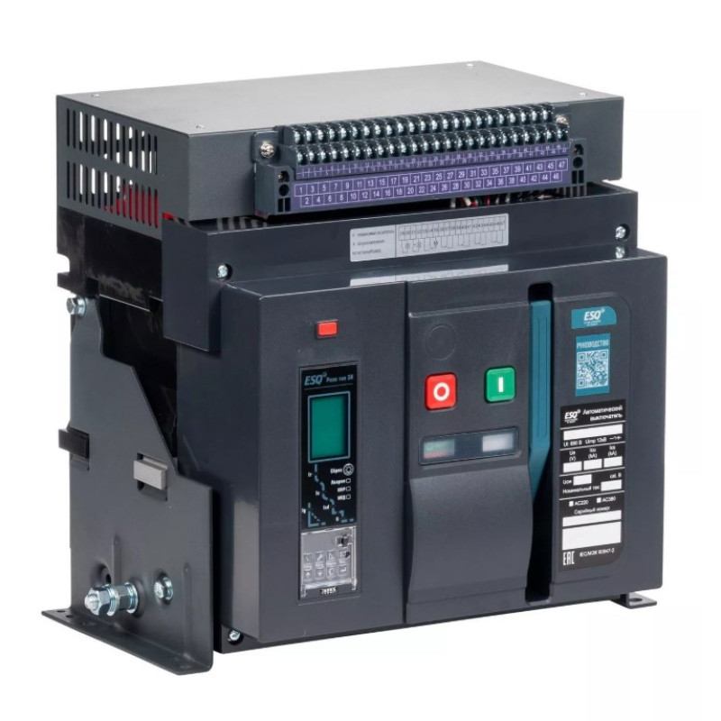 Воздушный автоматический выключатель ESQ ВА99-40B — это надежное устройство, предназначенное для защиты электрических цепей с номинальным током 3200 ампер и отключающей способностью 85 килоампер. Он оснащен электронным расцепителем типа М, который обеспечивает высокую точность срабатывания и защиту от перегрузок и коротких замыканий. Выключатель работает в диапазоне рабочих напряжений до 720 вольт, что делает его универсальным для различных промышленных применений.