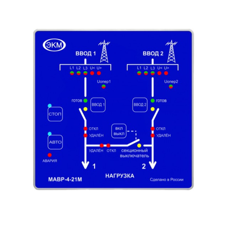 Модуль автоматического ввода резерва МАВР-4-21М (далее Устройство) предназначен для использования в схеме питания два ввода, две нагрузки с секционным выключателем. Устройство управляет коммутационными механизмами для переключения нагрузок с основного источника питания на резервный с помощью секционного выключателя, при возникновении аварии на основном вводе, и возврат к исходной схеме питания при нормализации рабочих параметров основного источника питания. Управление коммутационными механизмами осуществляется в ручном или автоматическом режиме. В качестве коммутационных механизмов могут применяться электромагнитные контакторы или автоматические выключатели с моторприводом. Устройство позволяет осуществлять удаленное управление и считывание состояний коммутационных механизмов и вводов по протоколу Modbus RTU через интерфейс RS-485.