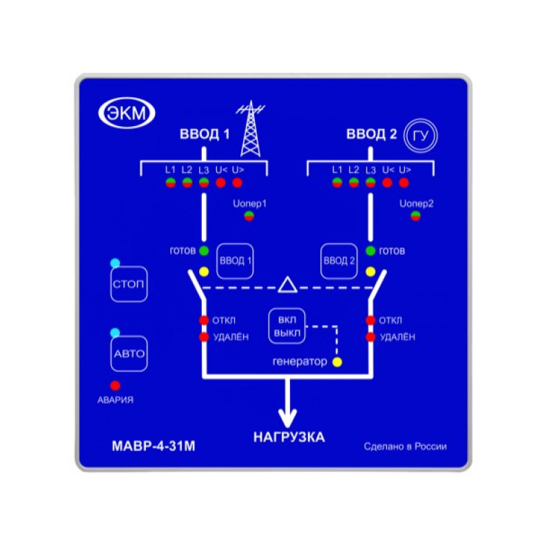 Модуль автоматического ввода резерва МАВР-4-31М предназначен для использования в схеме питания два ввода (где ВВОД 2 ГУ) и одна нагрузка. Устройство управляет коммутационными механизмами для переключения нагрузок с основного источника питания на резервный (Генераторная Установка) (при возникновении аварии на основном вводе) и возврат к исходной схеме питания при нормализации рабочих параметров основного источника питания. Управление коммутационными механизмами осуществляется в ручном или автоматическом режиме. В качестве коммутационных механизмов могут применяться электромагнитные контакторы или автоматические выключатели (с моторприводом). Устройство позволяет осуществлять удаленное управление и считывание состояний коммутационных механизмов и вводов по протоколу Modbus RTU через интерфейс RS-485.