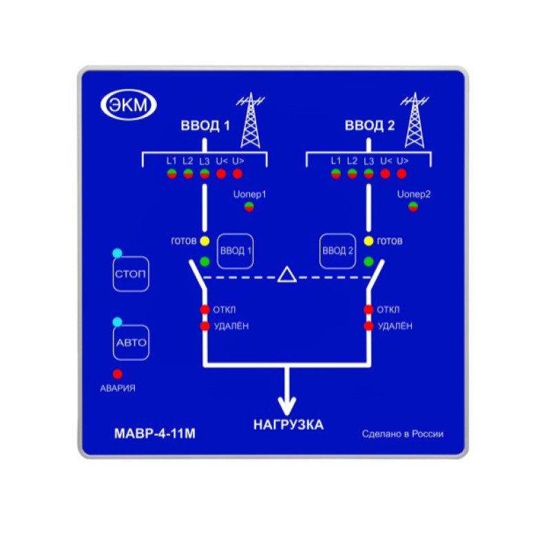 Модуль автоматического ввода резерва МАВР-4-11М (далее Устройство) предназначен для использования в схеме питания два ввода и одна нагрузка. Устройство управляет коммутационными механизмами для переключения нагрузок с основного источника питания на резервный (при возникновении аварии на основном вводе) и возврат к исходной схеме питания при нормализации рабочих параметров основного источника питания. Управление коммутационными механизмами осуществляется в ручном или автоматическом режиме. В качестве коммутационных механизмов могут применяться электромагнитные контакторы или автоматические выключатели (с моторприводом). Устройство позволяет осуществлять удаленное управление и считывание состояний коммутационных механизмов и вводов по протоколу Modbus RTU через интерфейс RS-485.