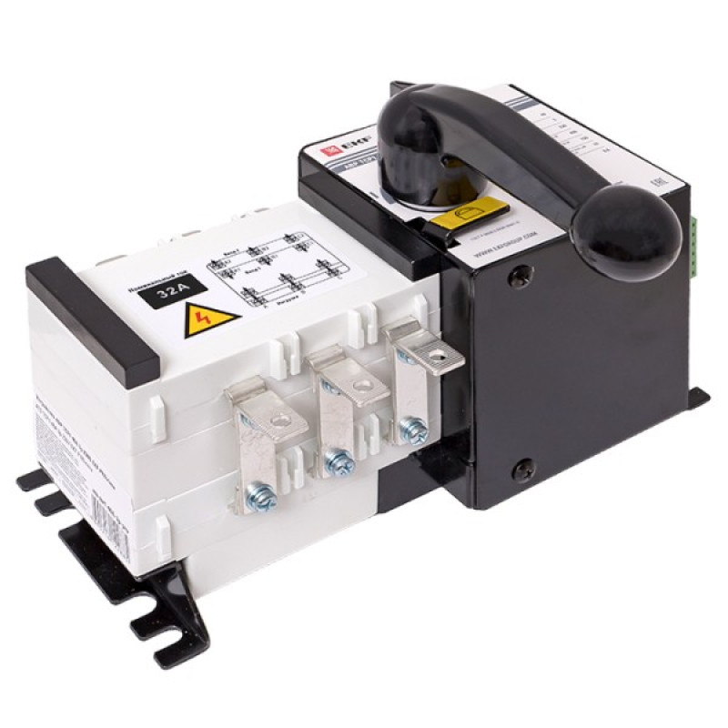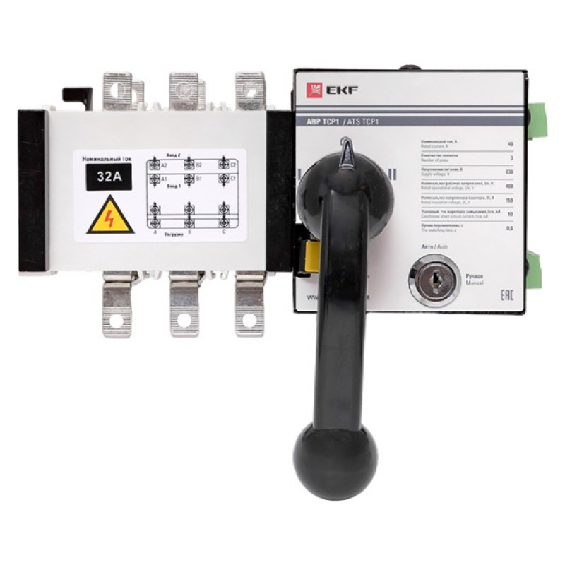 Устройство АВР EKF предназначено для обеспечения резервным электроснабжением нагрузки, подключенной к системе электрообеспечения, имеющей основной и резервный вводы. Устройство АВР автоматически подключает резервную линию питания в случае исчезновения напряжения на основной линии. Предназначен для трехфазных четырехпроводных (или однофазных однопроводных) систем двойного энергопитания переменного тока с частотой 50/60 Гц, номинальным напряжением 400 В/230 В и номинальным током до 63А. Устройство выполнено в виде моноблока и состоит из блока управления и двух модульных автоматических выключателей. На блоке управления имеется рычаг ручного переключения. Такая конструкция позволяет уменьшить габариты и площадь установки АВР.