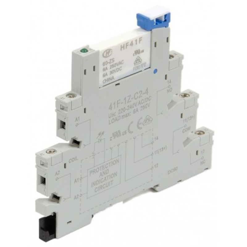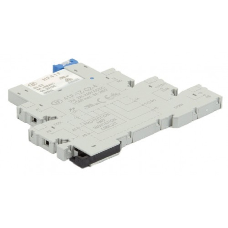 Промежуточные интерфейсные релеHF41-24-DA имеют одну группу контактов с нормально-открытым и нормально-закрытым контактами. Напряжение катушки составляет 24В DC, а номинальный ток контактов 6А.