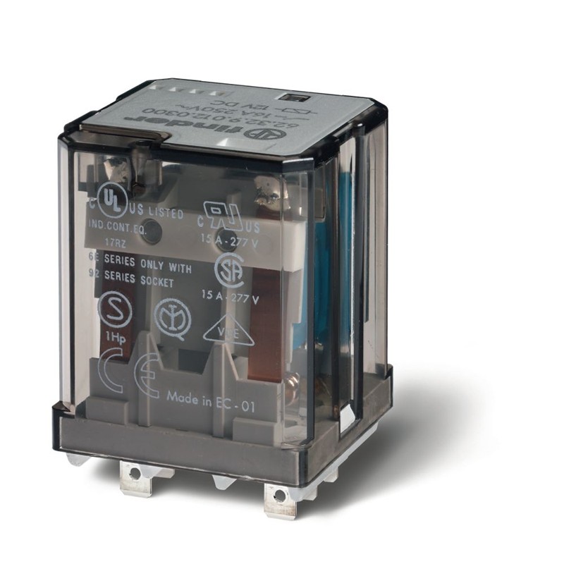 Реле силовое Finder электромеханич. монтаж в розетку или наконечники Faston 187 (4.8х0.5мм) 2CO 16А AgCdO 24В DC RTI опции: кнопка тест + мех. индикатор