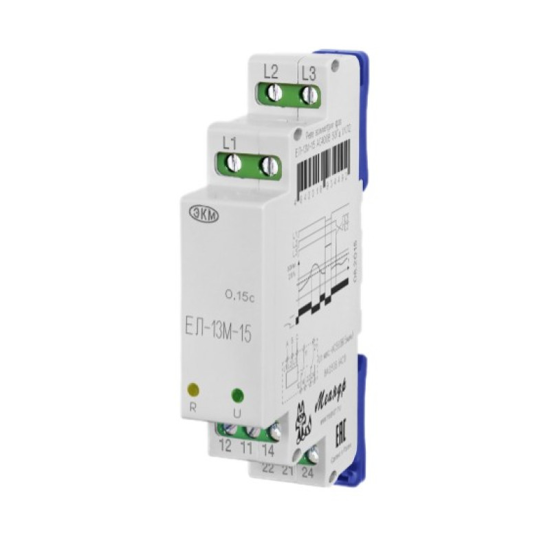 Реле контроля фаз ЕЛ-13М-15 предназначено для использования в схемах автоматического управления, контроля напряжения в трехпроводных трёхфазных сетях (сетях без нулевого провода), обрыва и «слипания» фаз, защиты нагрузки от работы на повышенном напряжении, а также для контроля асимметрии фаз. Основная область применения - защита крановых электродвигателей.