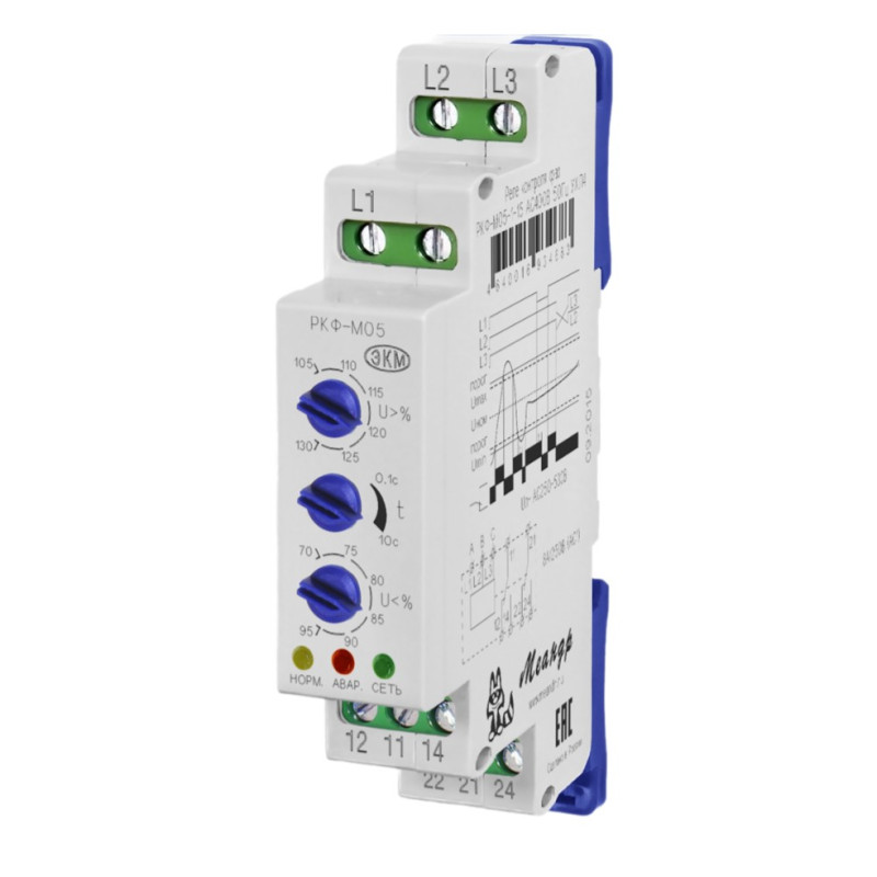 Реле контроля фаз РКФ-М05-1-15 предназначено для контроля параметров работы трехпроводных трехфазных сетей (трехфазных сетей без нейтрали), а так же защиты оборудования от работы на пониженном или повышенном напряжении из-за неполадок в сети. Питание реле осуществляется от контролируемой цепи.