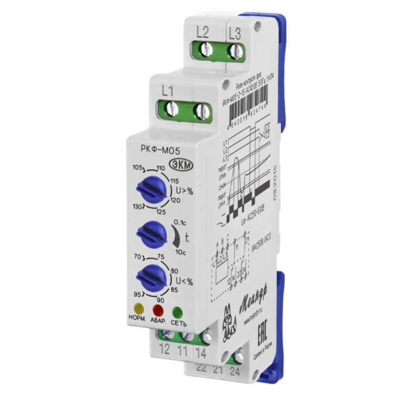 Реле контроля фаз РКФ-М05-2-15 предназначено для контроля параметров работы трехпроводных трехфазных сетей (трехфазных сетей без нейтрали), а так же защиты оборудования от работы на пониженном или повышенном напряжении из-за неполадок в сети. Питание реле осуществляется от контролируемой цепи.