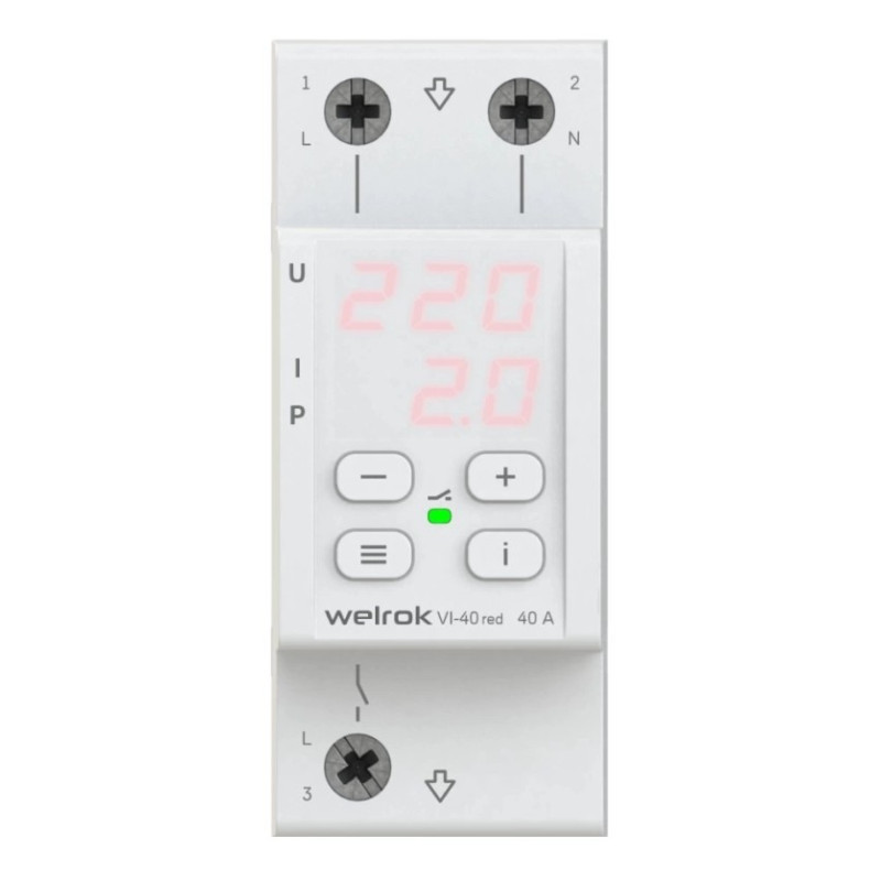 Реле напряжения с контролем тока Welrok VI red защищает оборудование от скачков и провалов напряжения, последствий обрыва нулевого провода и превышения тока или мощности. Реле отключает нагрузку, если напряжение, ток или мощность выходит за установленные пределы и автоматически включает нагрузку, когда значение параметра вернется в норму.