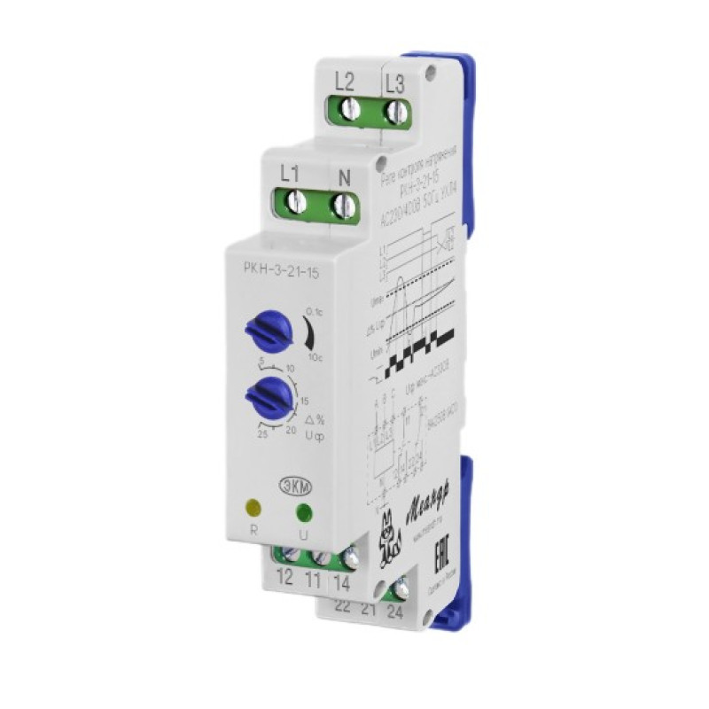 Реле контроля напряжения РКН-3-21-15 предназначено для контроля параметров работы четырехпроводных трехфазных сетей (трехфазных сетей с нейтралью), а так же защиты оборудования от работы на пониженном или повышенном напряжении из-за неполадок в сети. Питание реле осуществляется от контролируемой цепи.