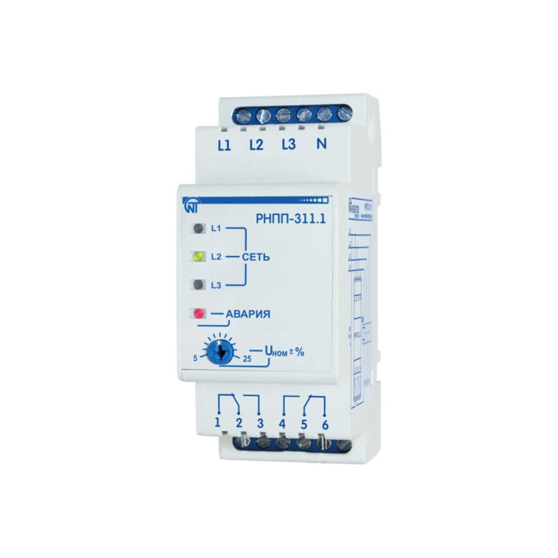 Реле напряжения, перекоса и последовательности фаз РНПП-311.1 предназначено для отключения нагрузки 400 В 50 Гц при недопустимых колебаниях напряжения в сети с продолжительностью не менее 0,02 с, нарушении амплитудной симметрии сетевого напряжения (перекосе фаз), обрыве, нарушении последовательности и слипании фаз.