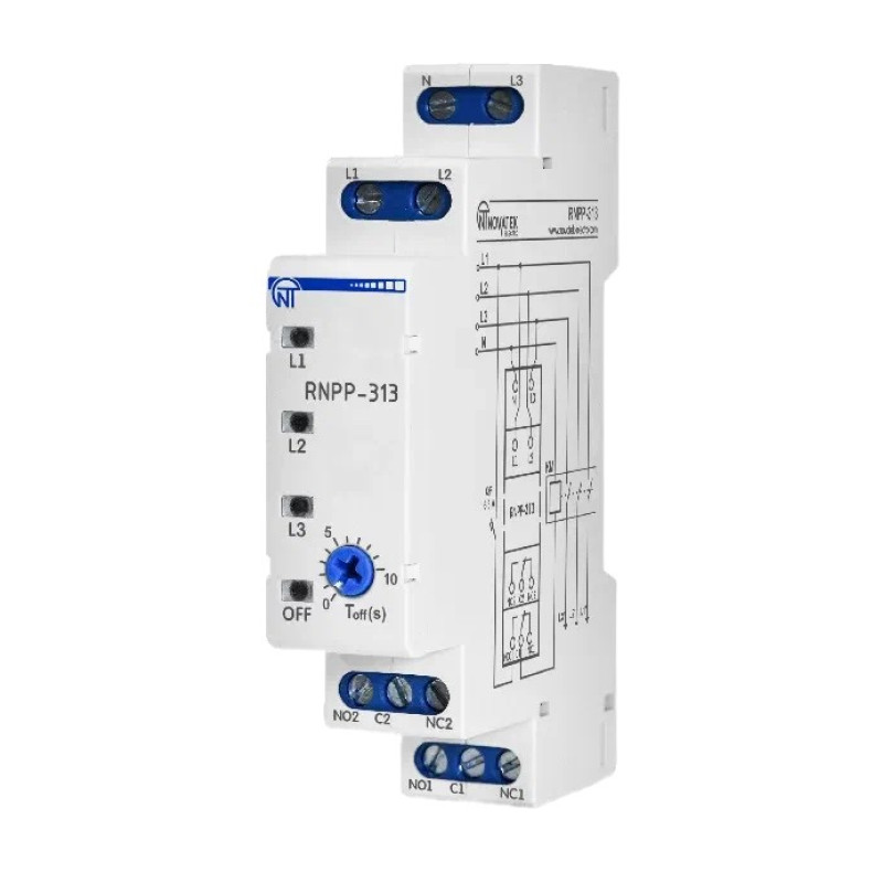 Реле напряжения, перекоса и последовательности фаз РНПП-313 предназначено для отключения нагрузки 400 В 50 Гц при - недопустимых колебаниях напряжения в сети с продолжительностью не менее 0,02 с, нарушении амплитудной симметрии сетевого напряжения (перекосе фаз), обрыве, нарушении последовательности и слипании фаз, обрыве нуля.