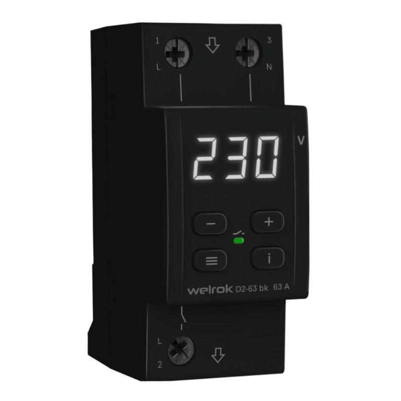 Реле напряжения Welrok d2-63 bk черного цвета защищает оборудование от скачков и провалов напряжения, обрыва нулевого провода. Реле отключает нагрузку, если сетевое напряжение выходит за установленные пределы. Когда значение напряжения вернется в норму, нагрузка будет автоматически включена обратно. Подключение можно сделать с транзитом или без транзита нуля через Welrok D2. При этом вход нуля может быть как вверху так и внизу реле.