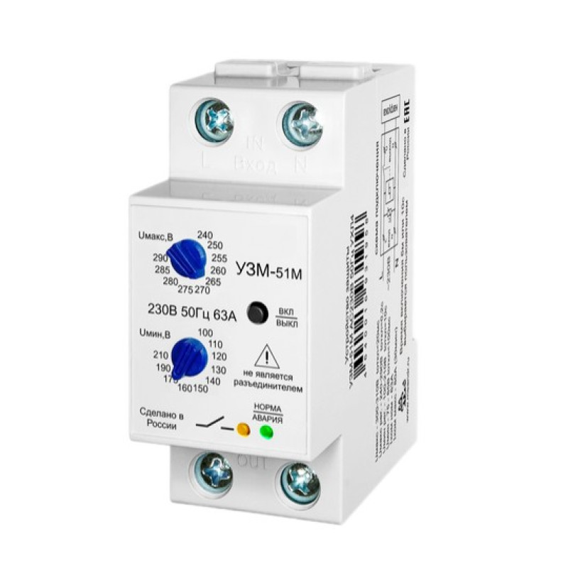 Устройство защиты многофункциональное УЗМ-51М (далее Устройство) предназначено для: 1) отключения оборудования при выходе значения напряжения в однофазных сетях за установленные параметры; 2) защиты оборудования (в квартире, офисе и пр.) от разрушающего воздействия импульсных скачков напряжения, вызванных срабатыванием близкорасположенных и подключённых к этой же сети двигателей, пускателей (и т.д.), тем самым предотвращая выход оборудования из строя и его возможное возгорание;