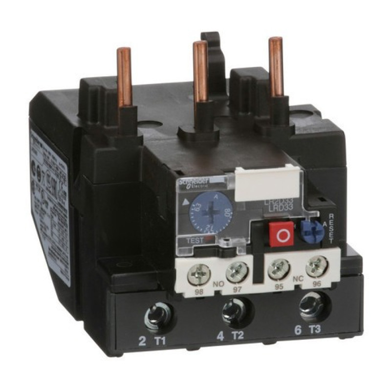 Преимущества: Безопасность и эффективная защита. Благодаря встроенной функции ручного и автоматического сброса и простой установке при помощи клемм с винтовым контактным зажимом, пружинных контактов, кольцевого зажима и клеммного блока EverLink, тепловые реле перегрузки модели LRD очень надежны и охватывают целый спектр типоразмеров двигателя вплоть до 150A. Использование тепловых реле перегрузки в сочетании с контакторами d TeSys образует чрезвычайно компактный пускатель