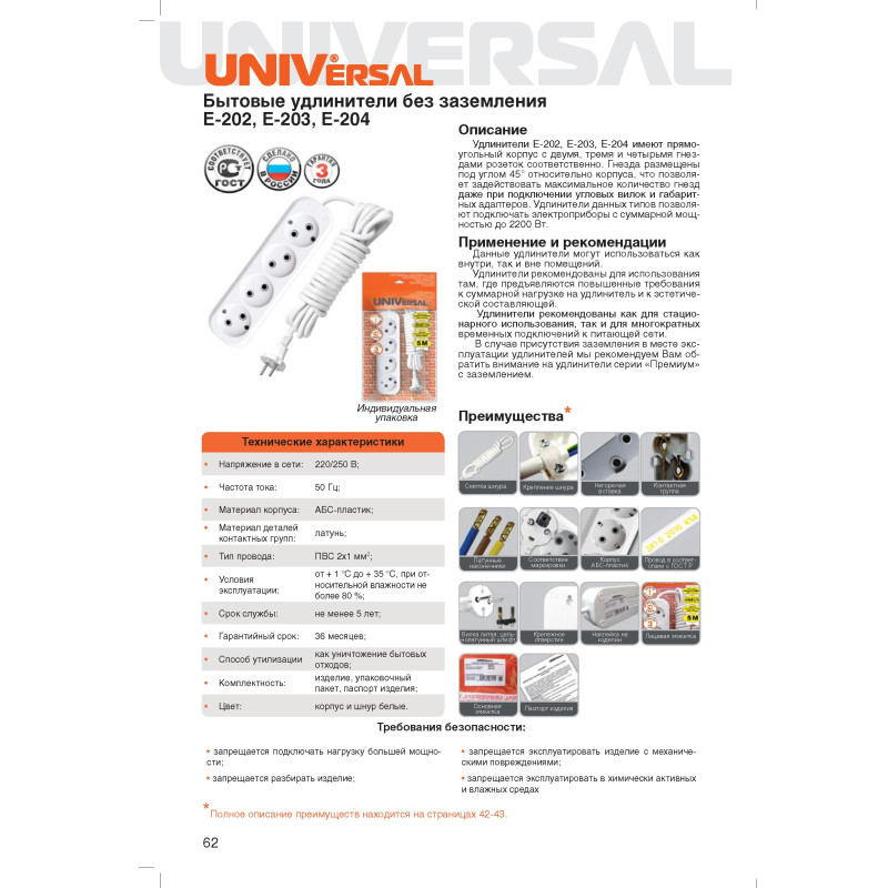 Удлинители серии в модификациях Е-202, Е-203, Е-204 без заземления, позволяют подключить приборы мощностью до 2200 Вт.