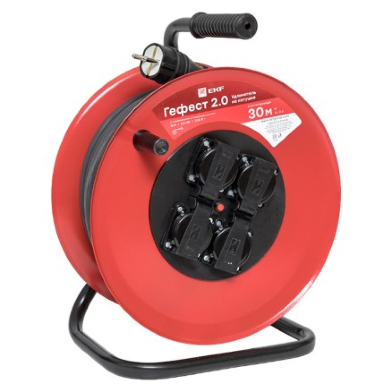 Удлинитель на катушке EKF PROxima Гефест 2.0 4 гнезда 30м с заземлением и предохранителем КГ 3*2,5 16А 3,5кВт IP44