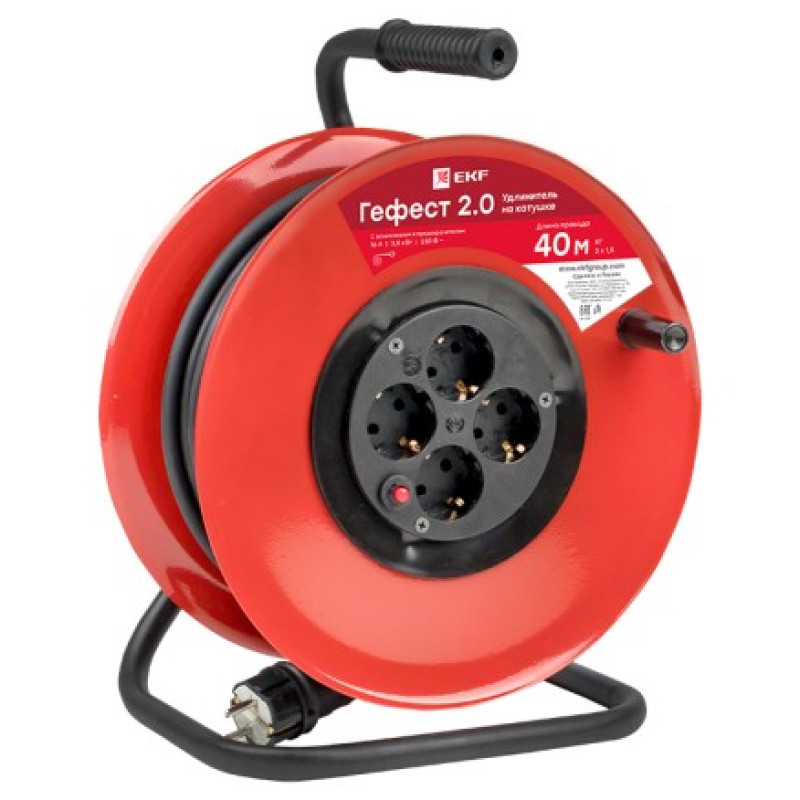 Удлинитель на катушке EKF PROxima Гефест 2.0 4 гнезда 40м с заземлением и предохранителем КГ 3*1,5 16А 3,5кВт