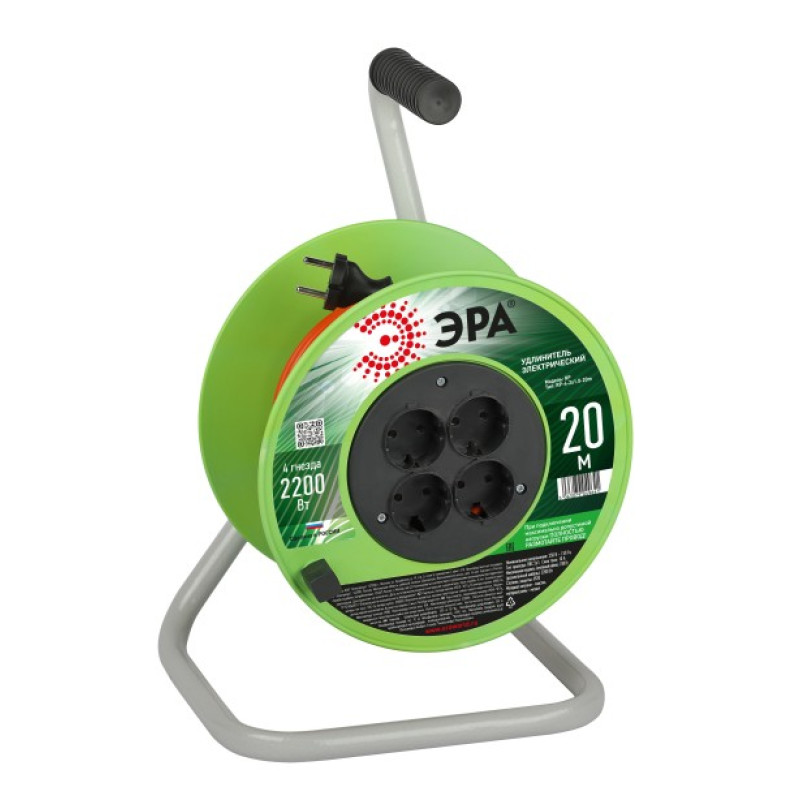 Удлинитель силовой на пластиковой катушке ЭРА RP-4-2x1.0-20m без заземления, 4 розетки, провод ПВС 2х1м2, 20 м. Мощность 10А/2200Вт. Используется для работы на строительных площадках или дачных участках. Удобен при работе с приборами, находящимися удаленно от стационарной розетки. Например, газонокосилки, электрические, пилы, триммеры или электродрели. Провод в удлинителях Эра сделан из 100% меди, что делает его абсолютно пожаробезопасным. Рама удлинителя сделана из высокопрочной стали, а пластиковой корпус выполнен с применением негорючих добавок.