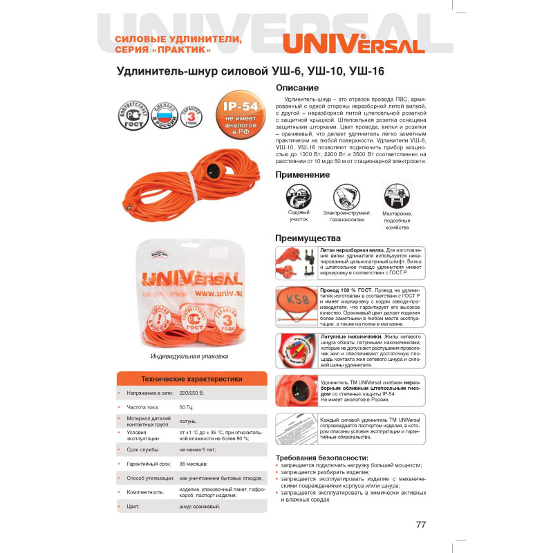 Удлинитель УШ-10 IP-54 шнур ПВС 2x1 20м UNIVersal 9632780 предназначается для использования в тяжелых эксплуатационных условиях при повышенной влажности и запыленности окружающей среды. Изделие подходит для удаленного подключения к стационарной сети 220 В различного электроинструмента, садовой техники и прочего оборудования.