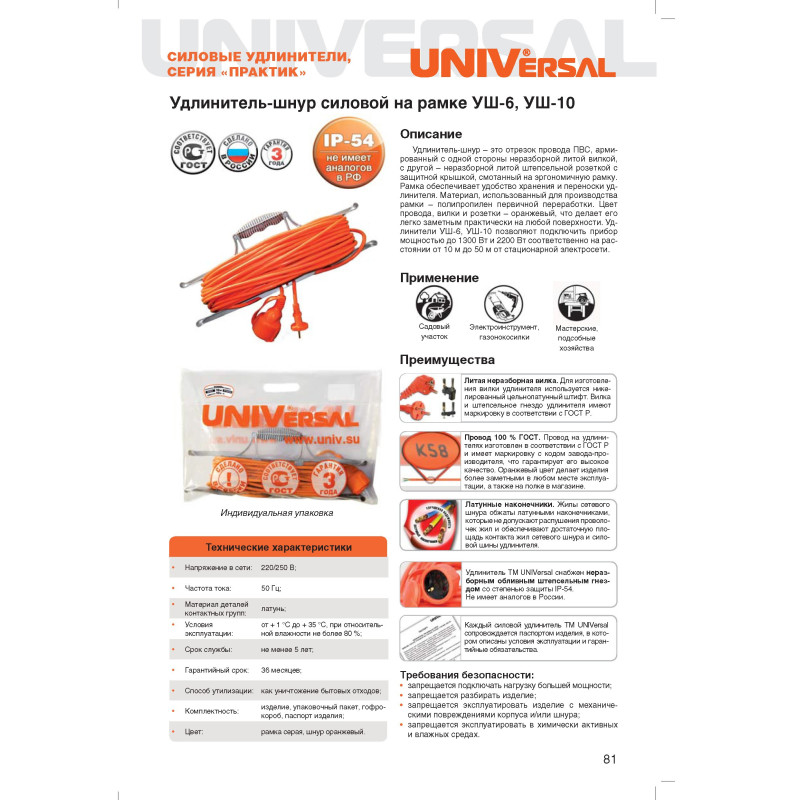 Удлинитель шнур на рамке UNIVersal УШ-10 IP-54 ПВС 3*0.75 1гн. з/к 40 м 9632025 предназначен для подключения газонокосилок, инструмента мощностью 2.2 кВт на расстоянии 40 метров от стационарной сети. Рамка из полипропилена первичной переработки служит для сматывания шнура и аккуратного хранения изделия без риска спутывания. Эксплуатация приспособления возможна как внутри помещений, так и на открытом воздухе.