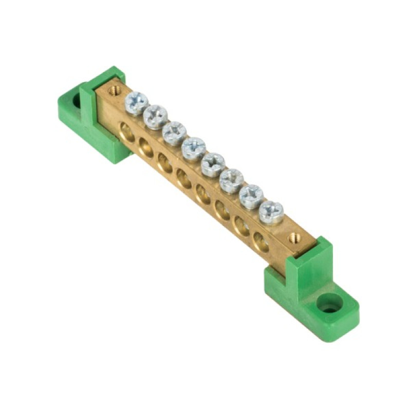 Шина нулевая EKF PROxima PE 8х12 8 отверстий латунь с контактной пластиной 2 зеленых угловых изолятора