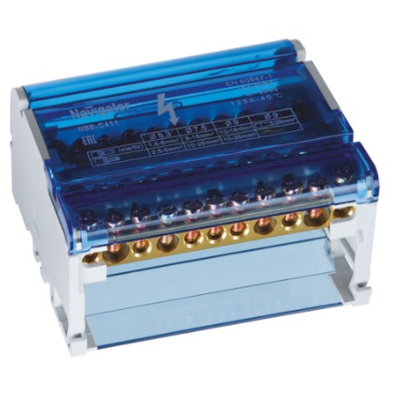 Нулевые шины в корпусе NBB- C предназначены для комплектации щитового оборудования при подсоединении нулевого провода и провода заземления. Номинальное напряжение Ui 500 В Шины из латуни. Прижимные винты из электротехнической бронзы. Изолирующая задняя панель и защитная крышка из негорючего пластика.