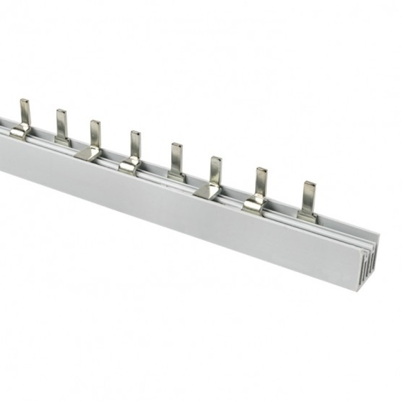 Шины соединительные представляют собой пластины, выполненные из меди, закрепленные в корпусе из диэлектрического материала, не поддерживающего горение, и выпускаются стандартной длиной 1 метр. Шины соединительные делятся на два типа - FORK и PIN на номинальные токи 63 и 100 А.