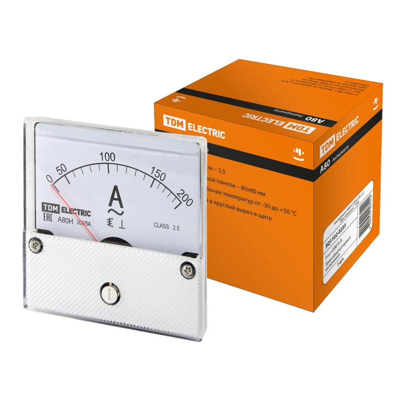 Амперметр TDM А80Н 200А/5А-2.5 предназначен для измерения силы тока в однофазных электрических цепях переменного тока. Применяется в низковольтных комплектных устройствах распределительных электрических сетей жилых, общественных и производственных объектах.