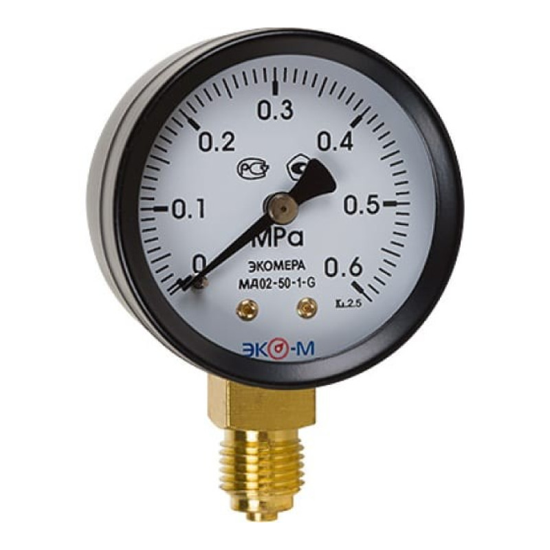 Манометр ЭКО-М Экомера МД02-50мм 0..0,6МПа G1\4 МД02-50-G-0,6МПа-РИ предназначен для измерения давления газообразных и жидких, не сильновязких и кристаллизующихся сред, не агрессивных по отношению к медным сплавам (вода, пар, газ) или вакуума.