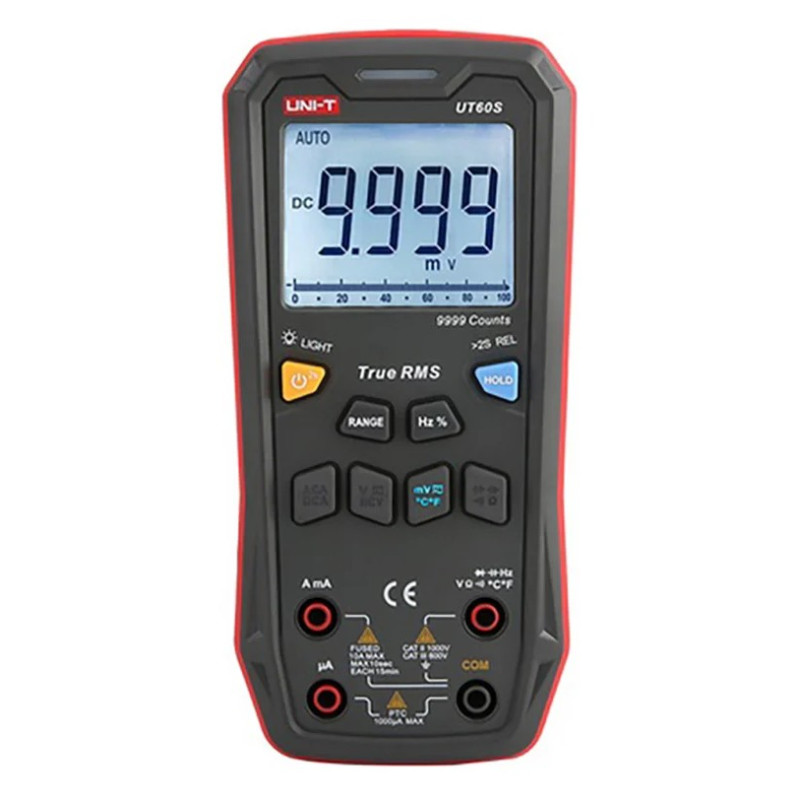 Профессиональный TRUE RMS мультиметр UNI-T UT60S применяется для измерения постоянного/переменного напряжения до 1000 В, силы тока до 10 А, сопротивления до 100 Мом и температуры с большим разрешением и точностью. В приборе используются только кнопочные выключатели и переключатели для изменения функций и параметров.