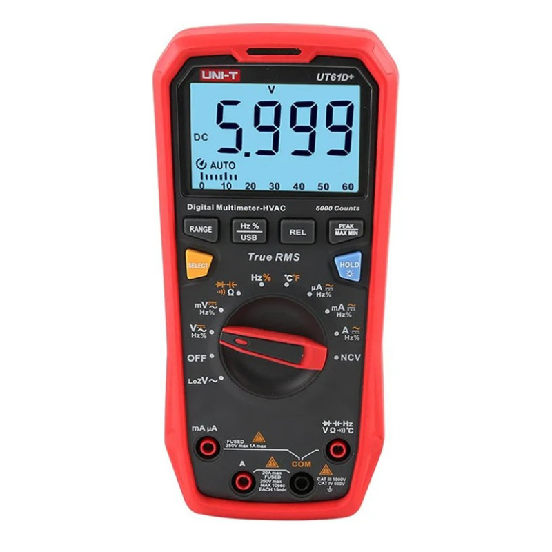 Профессиональный TRUE RMS мультиметр последнего поколения UNI-T UT61D+ с ударопрочным корпусом применяется с целью измерения постоянного/переменного напряжения, силы тока, сопротивления, емкости и частоты с большим разрешением и точностью. Призван заменить сразу снятые с производства модели 61C и 61D. Присутствует LoZ (вход с низким импедансом), аналоговая шкала. Дисплей на 6 000 разрядов с подсветкой облегчает считывание результатов при слабом внешнем освещении. Функция удержания данных обеспечивает удобство при работе в местах с ограниченным доступом. Выбор диапазона измерения производится автоматически или вручную.