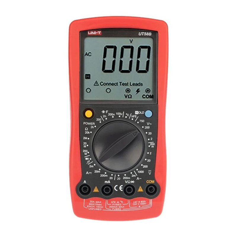 UT58B — это профессиональный мультиметр с современным и эргономичным дизайном. Предназначен прибор для измерений постоянного и переменного напряжения, сопротивления, постоянного и переменного тока. Кроме того, он имеет функции измерения электрической емкости и температуры, а также с его помощью вы сможете тестировать диоды и проводить прозвонку целостности цепи. Данный прибор обладает высоким классом точности показаний.