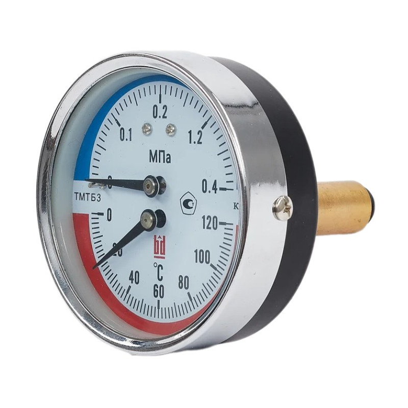 Термоманометр тип ТМТБ комбинированный прибор, для измерения давления и температуры сред, агрессивных по отношению к медным сплавам и не агрессивных по отношению к нержавеющей стали.