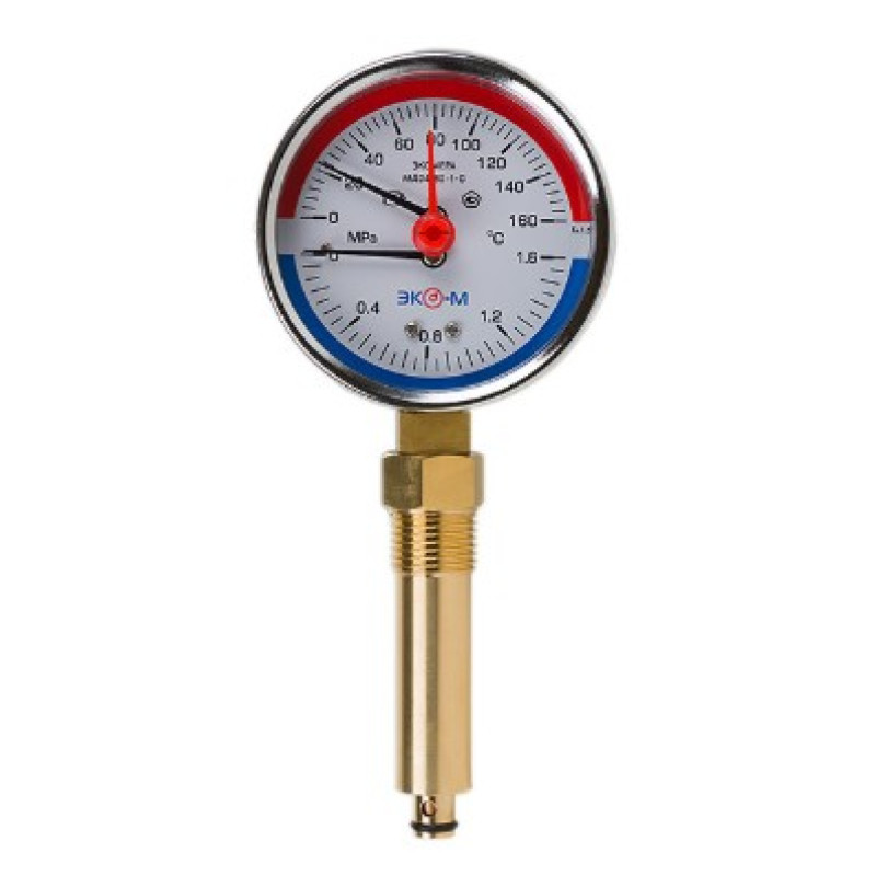Термоманометр объединяет в одном корпусе манометр и термометр, имеет две шкалы – давление и температура. Прибор комплектуется клапаном, позволяющим демонтировать термоманометр без разгерметизации системы.