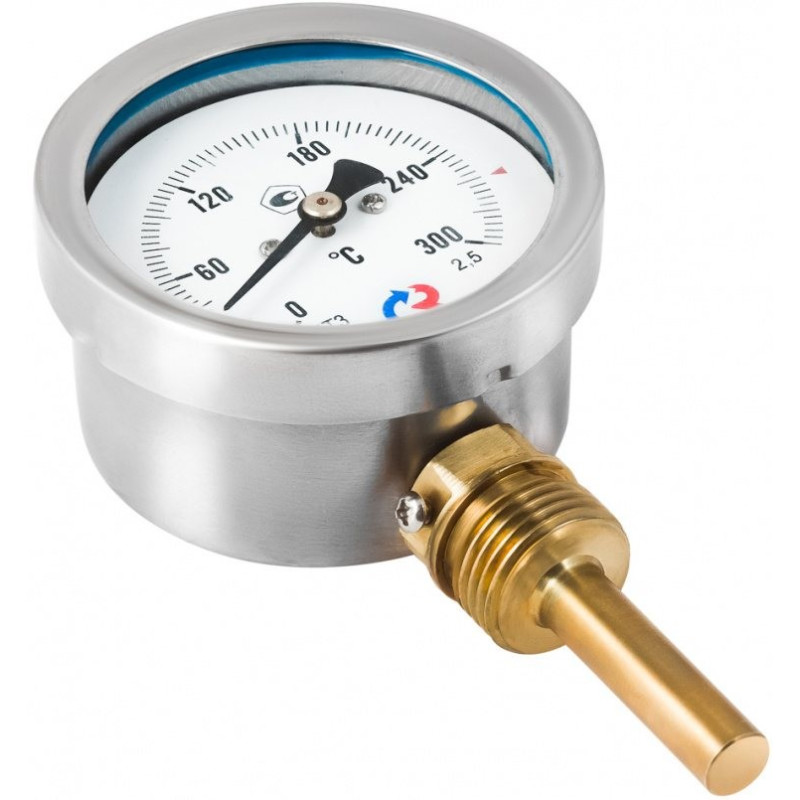 БТ-32.211(0-100С)G1/2.46.2,5. Радиальное присоединение в комплекте с защитной латунной гильзой. Термометр радиальный биметаллический предназначен для измерения температуры жидкостей, пара и газов в отопительных и санитарных установках, в системах кондиционирования и вентиляции. Принцип действия термометра основан на зависимости деформации чувствительного элемента от измеряемой температуры. В качестве чувствительного элемента используется биметаллическая пружина. Биметаллическая пружина изготавливается из двух прочно соединенных металлических пластин, имеющих различные температурные коэффициенты линейного расширения. При изменении температуры пружина изгибается и вращает стрелку термометра. Один конец пружины закреплен внутри штока, а к другому присоединяется ось стрелки. Корпус термометра изготавливается из коррозионностойкой стали, шток — из нержавеющей стали.
