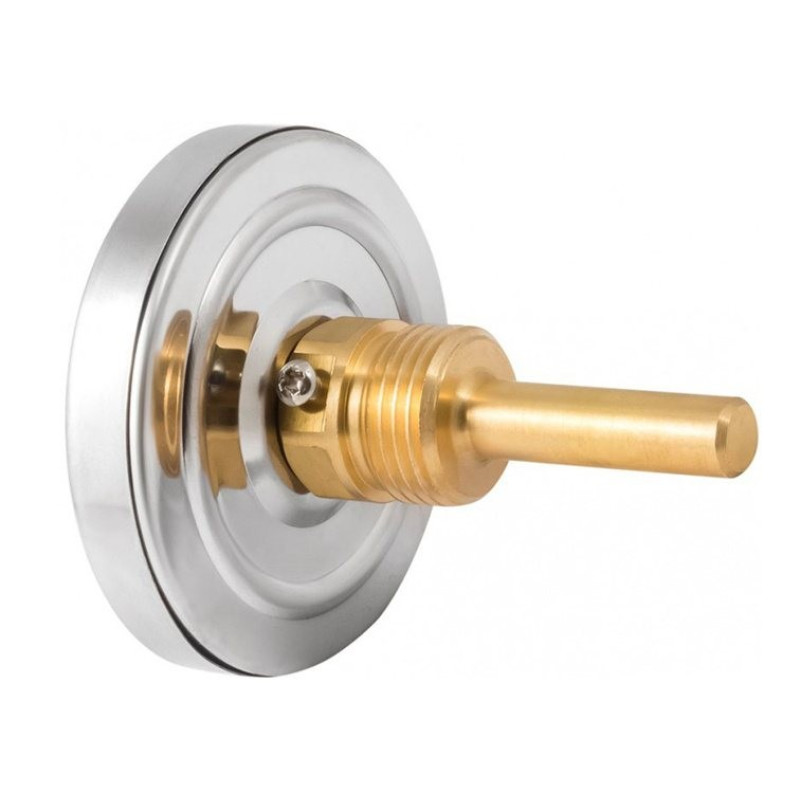БТ-31.211 (0...200С) G1/2.100.2,5. Термометр биметаллический (осевое присоединение) в комплекте с защитной латунной погружной гильзой. Прибор предназначен для измерения температуры жидкостей, пара и газов в отопительных и санитарных установках, в системах кондиционирования и вентиляции. Принцип действия термометра основан на зависимости деформации чувствительного элемента от измеряемой температуры. В качестве чувствительного элемента используется биметаллическая пружина. Она изготавливается из двух прочно соединенных металлических пластин, имеющих различные температурные коэффициенты линейного расширения. При изменении температуры пружина изгибается и вращает стрелку термометра. Один конец пружины закреплен внутри штока, а к другому присоединяется ось стрелки. Корпус термометра изготавливается из коррозионностойкой стали, шток — из нержавеющей стали.